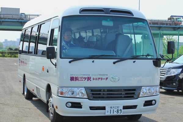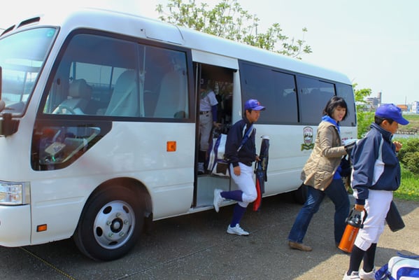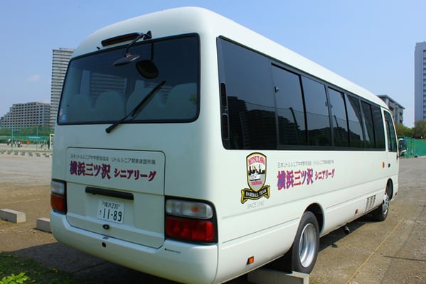 試合や練習など各活動場所へはチーム専用のマイクロバス(29人乗り)で移動します。 午前中にYM練習場(専用練習場)で練習をして、午後は移動…という時も活躍しています。